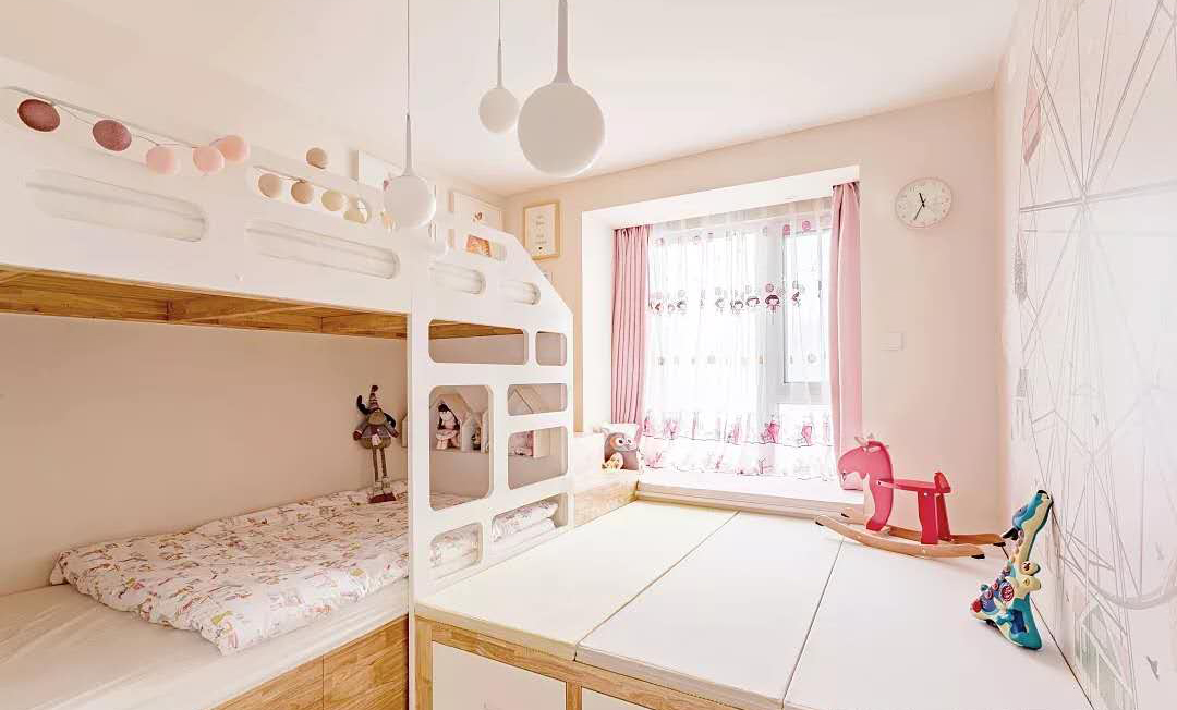 上下床的床头都做了开放格,里面可以放上小朋友喜欢的毛绒玩具,再配上云朵的壁灯,暖暖的。除了榻榻米能储物以外,下床箱也做成了带滑轮可抽拉的柜体,并且进门处也配备了衣柜。孩子再大些,还可以把下床箱挪走,换成下桌上床的模式。