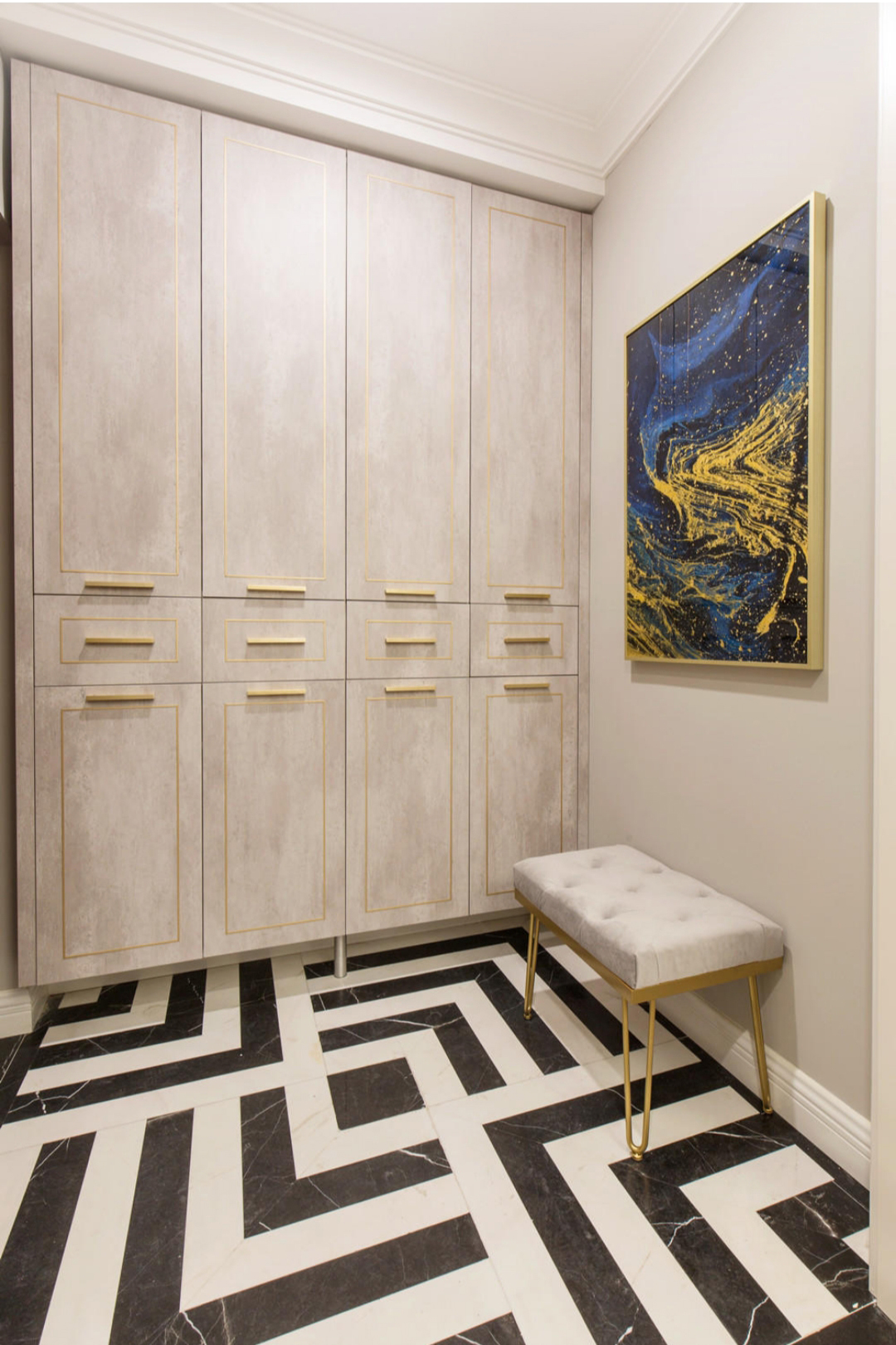 ▲入户一侧的橱柜补充了存储功能,金属色线条搭配蓝色银河画更具艺术。