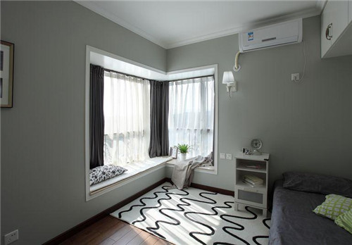 虽说图中的装扮较为单调,不过黑白灰的经典相配确是许多男士钟爱的格调,两层的窗帘可进行随意的切换,白色打底透光,灰色增加了隐私性,另外下方榻榻米的设计也为居室增添了不少的空间,可以看出户主很有生活品味。