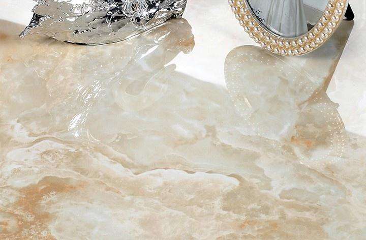 2、从触感上来说,全抛釉砖表面平滑、柔和,晶莹透亮,釉下石纹纹理清晰自然,与上层透明釉料融合后,犹如一层透明水晶釉膜覆盖,使得整体层次更加立体分明。