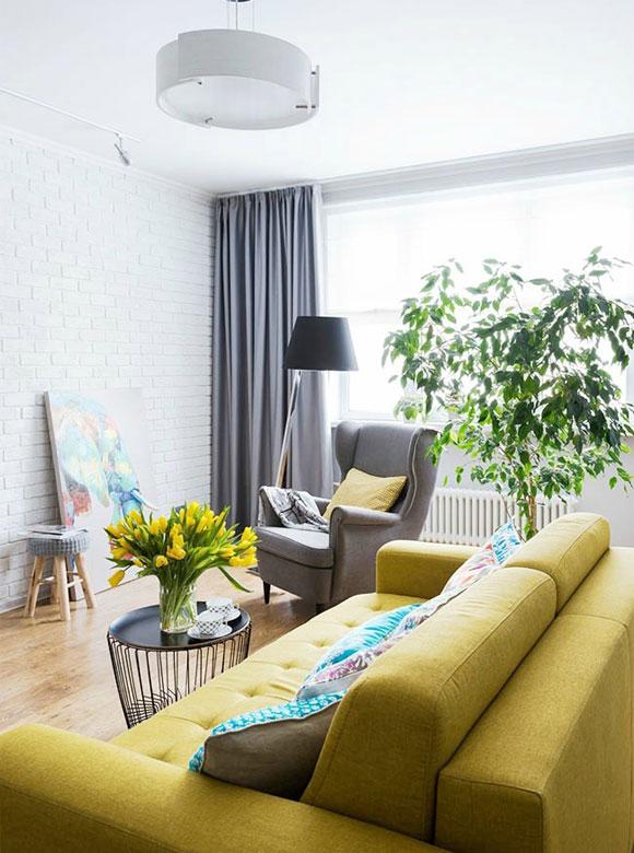 客厅的面积有些狭小,毕竟是卧室改造的。屋主购置了一张黄色布艺沙发,配上一张浅灰色的单人沙发,前面再摆上一张北欧风圆形铁艺茶几,设计简洁的客厅环境清爽舒适。对于面积不大的客厅来说,家具的选择一定要注意,特别是沙发的体积尽量不要太大,更不要一味去追求高级感,一组体积小巧的布艺沙发就非常合适。
