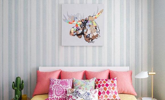 带阳台的卧室,将卧室和阳台打通之后,增加了卧室的实际使用面积,带来更加宽松更加舒适的生活体验。床头背景墙采用条纹图案的墙纸来装饰,提升卧室的设计感,也从视觉上拉伸了空间的层高。整间卧室的装饰设计非常简洁,白色的双人床铺上粉色、黄色、灰色的床上用品,简约清爽也特别的舒适。