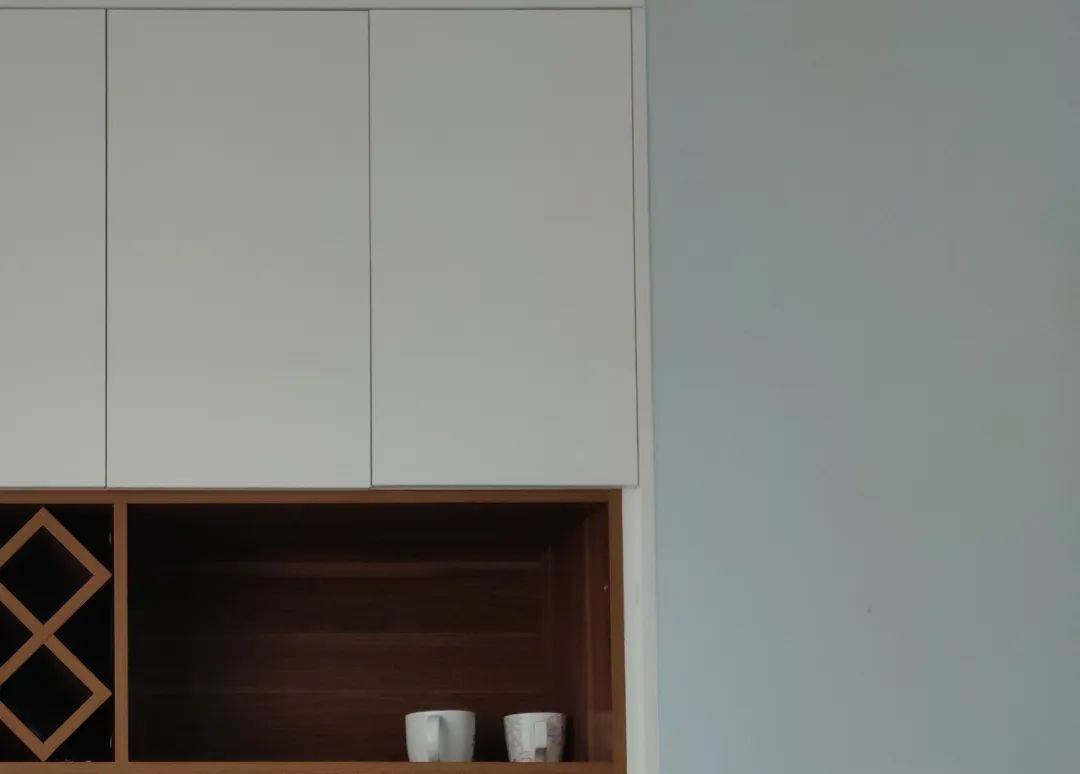 定制餐边柜,柜体与墙面之间的衔接收口,这个位置一定要注意做好!一方面是要保障墙面平整度,避免墙面与柜体之间不平整;一方面是衔接缝隙的收口,可以用环保玻璃胶填充,实现美观自然的收口。