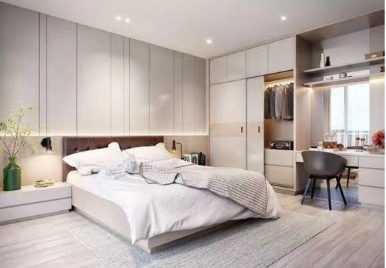 三,卧室定制柜:在现代家庭中,不建议单独买柜子,根据空间的尺寸定制整体衣柜,可以大大提高卧室的使用率,还可以加入梳妆台、书桌等功能。