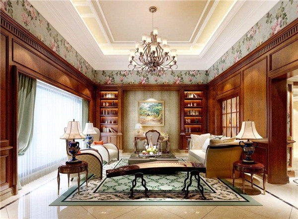 欧式风格的家装,一般的客厅面积都较大,给人的感觉很华丽高贵,因此选择造型极其讲究,有着繁复设计的水晶灯,营造出一种端庄典雅的感觉。